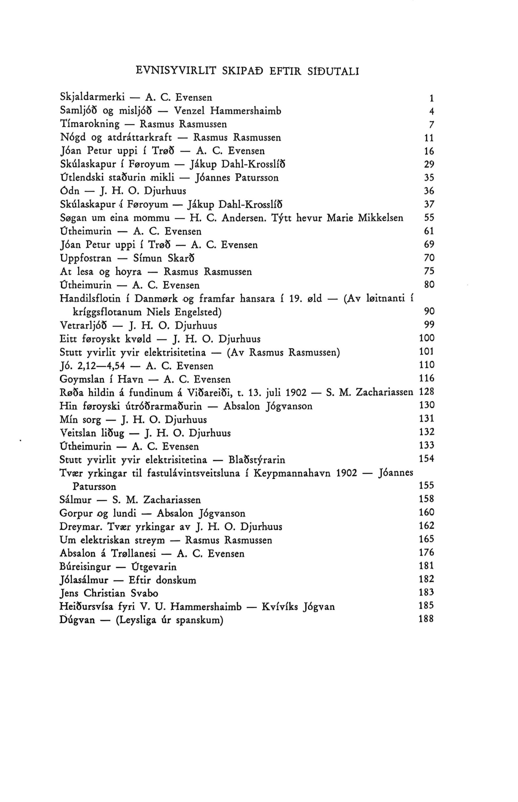 Í 1910 A. C. Evensen: Kvæðabók 1. R. Rasmussen: Plantulæra.